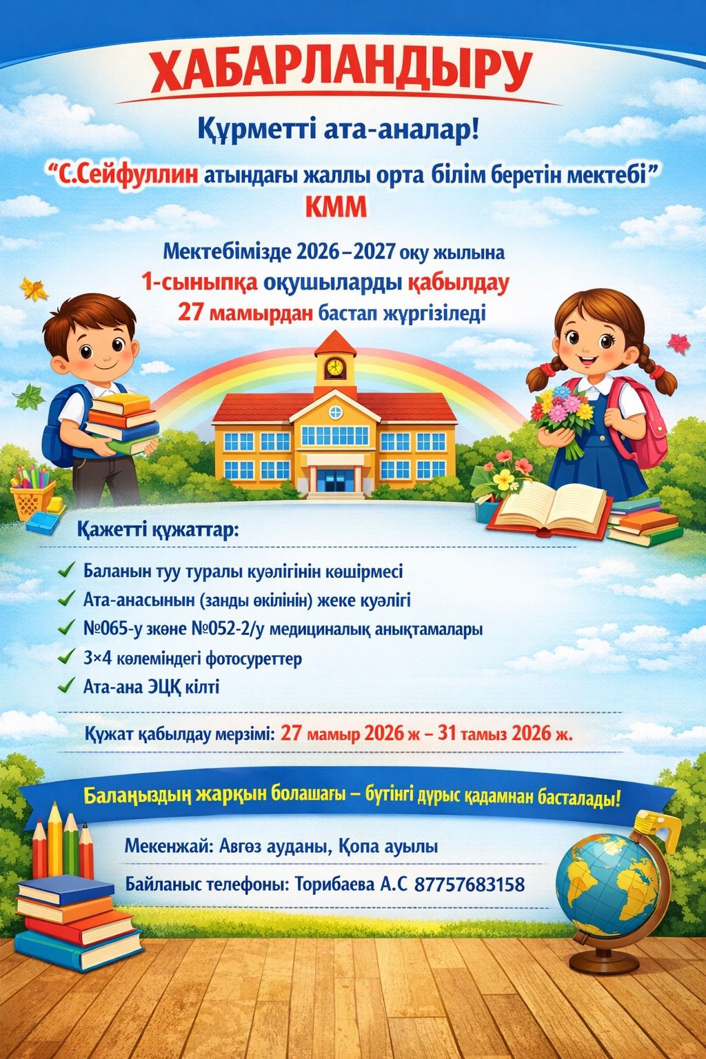 1-сыныпқа қабылдау туралы мәлімет