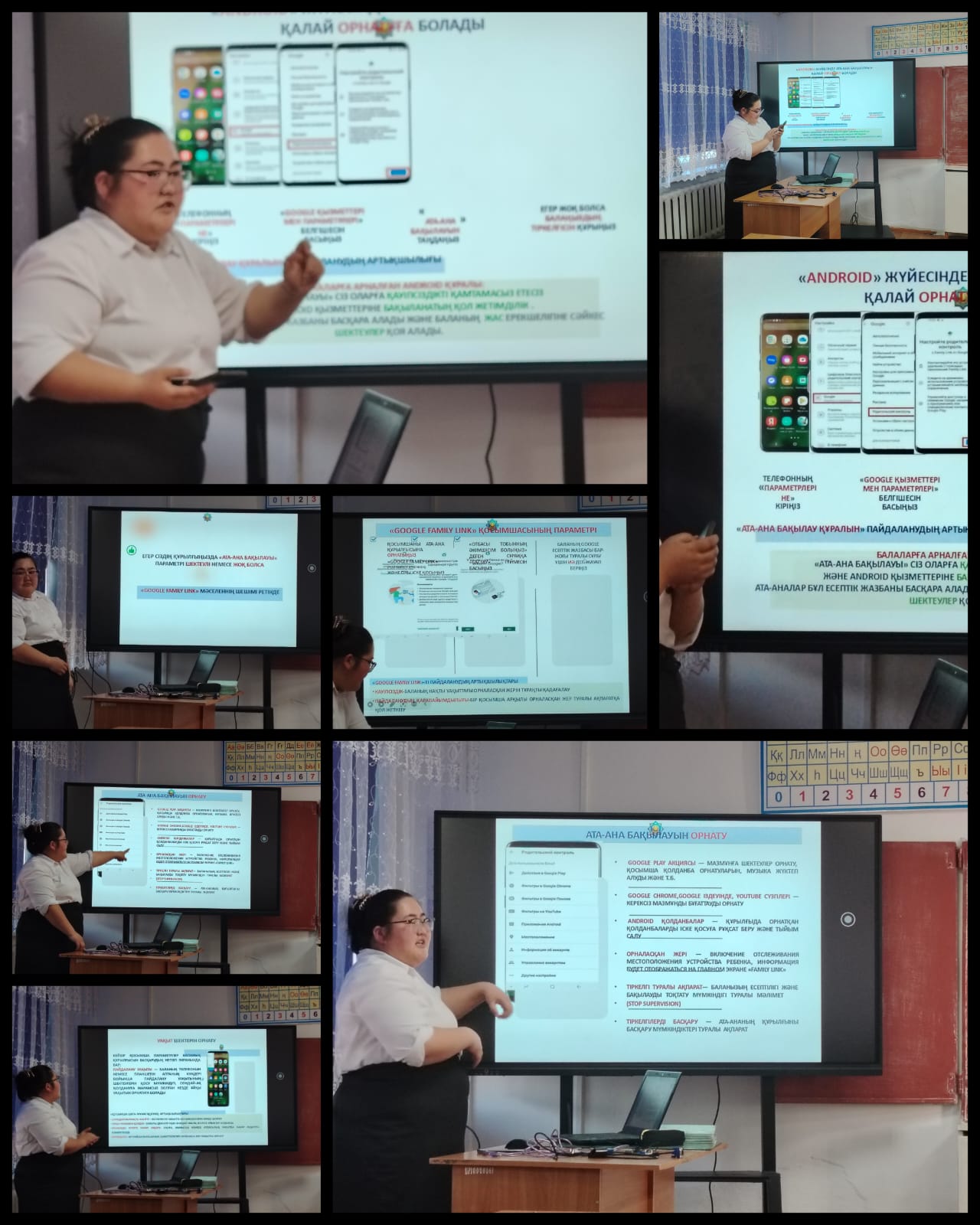 Абай облысы білім басқармасы Аягөз ауданы білім бөлімінің “С. Сейфуллин атындағы ЖОББМ” КММ-де АТА-АНА ЖӘНЕ ОҚУШЫЛАРҒА АРНАЛҒАН «БАЛА ҚАУІПСІ3ДІГІ» ТРЕНИНГ САБАҚТАРЫНЫҢ Бағдарламасы негізінде Ата-аналарға арналған сабақтар 1-4 сыныптардың ата аналарының арасында кезекті педагогикалық қолдау сабақтары өтті. Тақырып: Цифрлық қауіпсіздік және баланы онлайн ортада қорғау. Мақсаты: Ата-аналардың балаларға қатысты онлайн ортадағы зорлық- зомбылық тәуекелдері туралы хабардарлығын арттыру және оларды кибербуллингтен қорғау дағдыларын қалыптастыру Педагогикалық қолдау сабақтарында сауалнамалар алынып, түрлі байланыс құралдарын дұрыс пайдалану жолдарына түсіндірме жұмыстар жүргізілді. Ақпарат құралдарынан