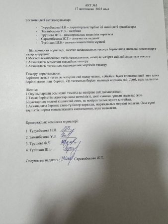 Мектеп сайты » Питание » Ыстық тамақ бракераждық комиссиясының актісі №5 2025-2026 оқу жылы
