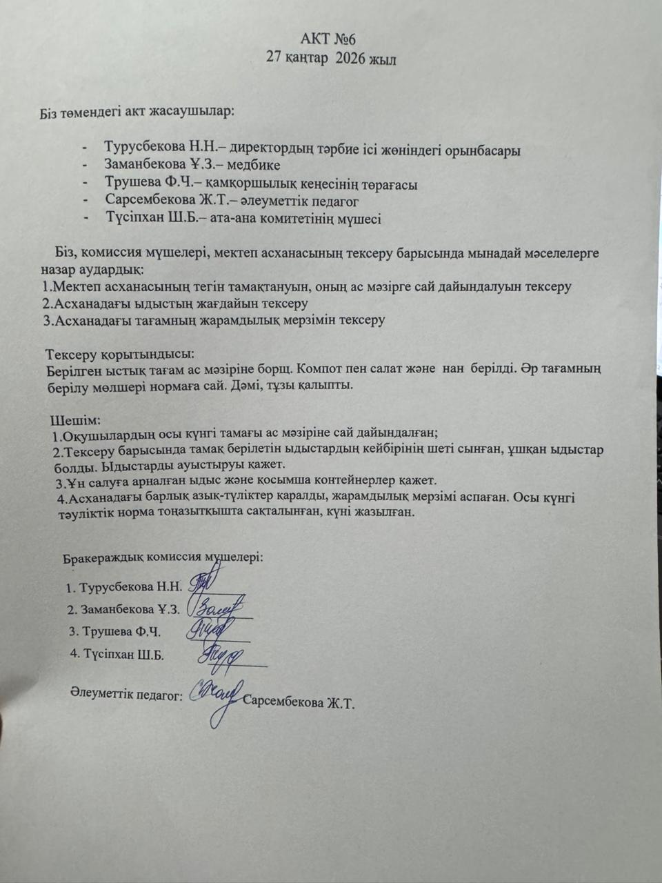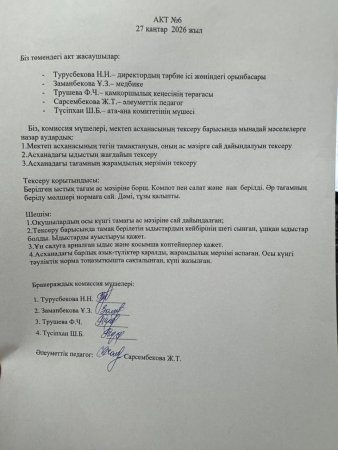 Мектеп сайты » Питание » Ыстық тамақ бракераждық комиссиясының актісі №6 2025-2026 оқу жылы
